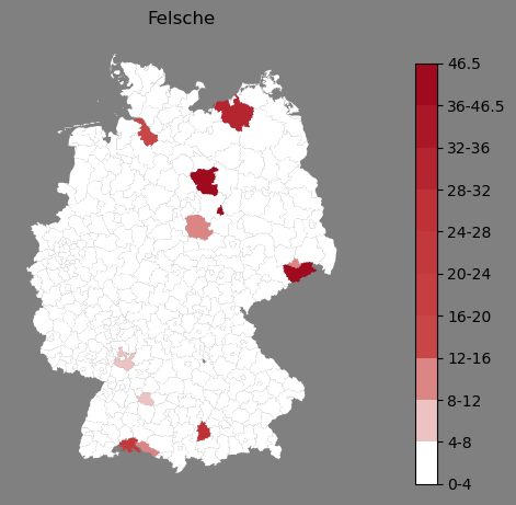 Relative Verteilung des Namens Felsche (1996)Direkt zur Karte Die Farbskala zeigt die Anzahl von "Felsche" bezogen auf je 1 Million Einträge. |