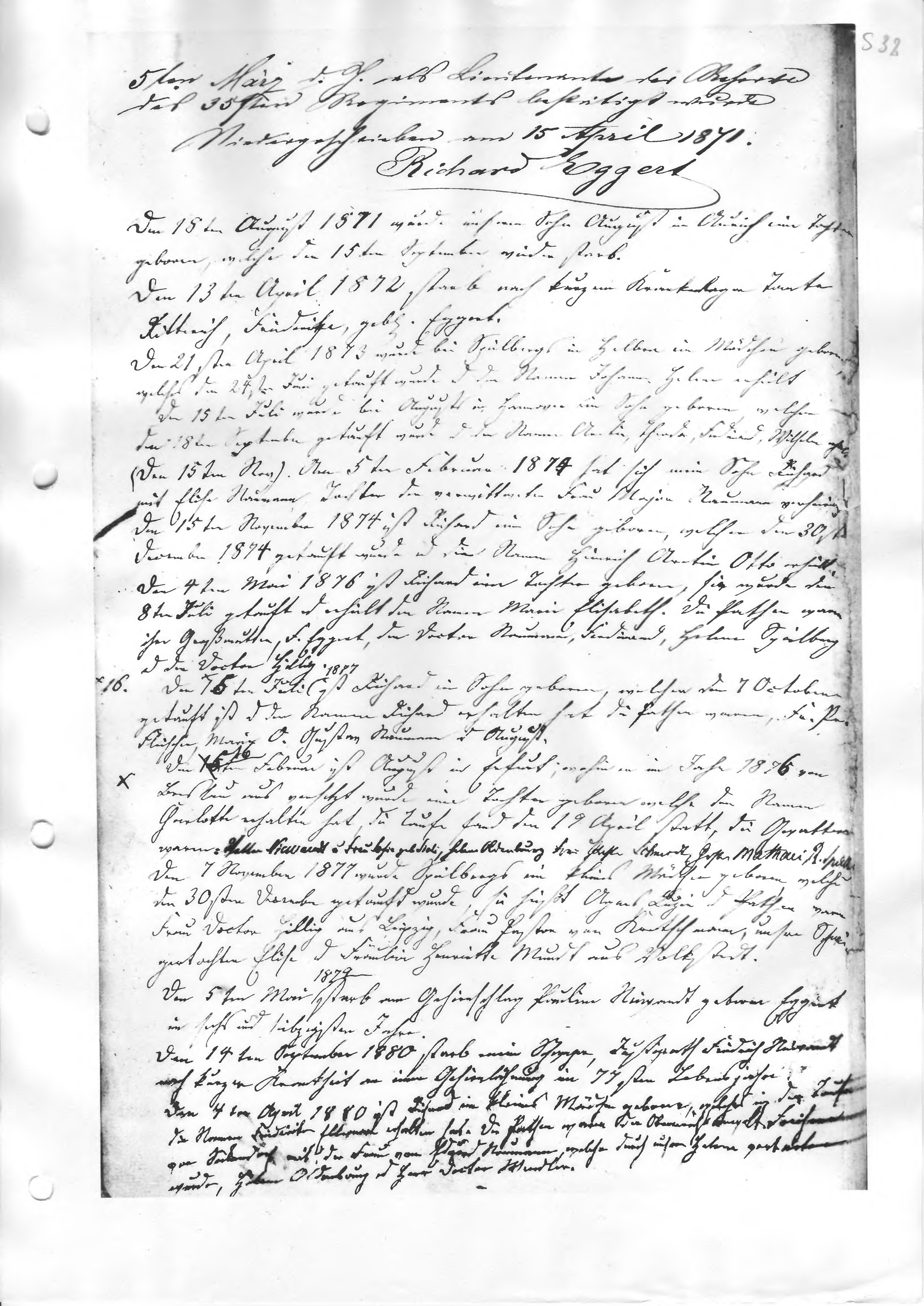 Den 15 ten November 1874 ist Richard ein Sohn geboren, welcher den 20 ten December 1874 getauft wurde und die Namen Heinrich Aretin Otto erhielt.
