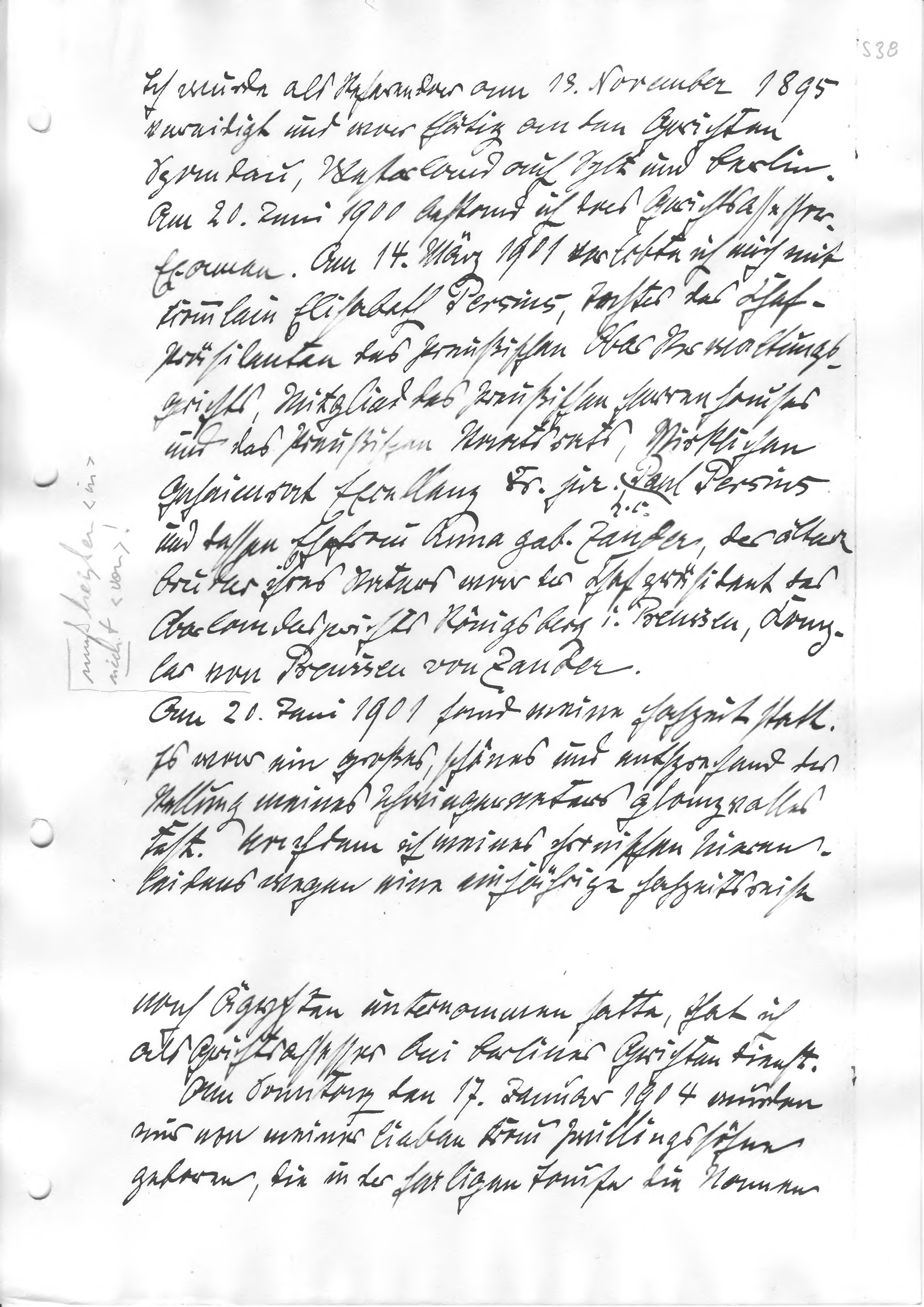 Am 20. Juni 1900 bestand ich das Gerichtsassessorexamen. Am 14. März verlobte ich mich mit Fräulein Elisabeth Persius, Tochter des Chefpräsidenten des preußischen Oberverwaltungsgerichts, Mitglied des Preussischen Herrenhauses und des Preussischen Staatsrats, Wirklichen Geheimrat Excellenz Dr. jur. h.c. Paul Persius und dessen Ehefrau Anna geb. Zander. Der ältere Bruder ihres Vaters war der Chefpräsident des Oberlandesgerichts Königsberg in Preussen, Kanzler von[1] Preussen von Zander.