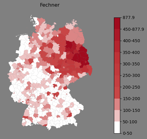 Absolute Verteilung des Namens Fechner (1890)Direkt zur Karte Absolute Verteilung des Namens "Fechner" um 1890 im damaligen Deutschen Reich Sie können die Karte innerhalb des Fensters zoomen und verschieben. |