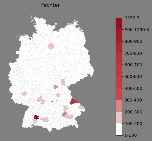 Relative Verteilung des Namens Fechter (1996)Direkt zur Karte Die Farbskala zeigt die Anzahl von "Fechter" bezogen auf je 1 Million Einträge. |