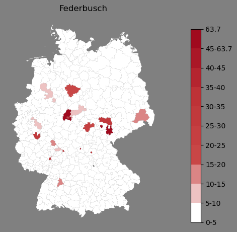 Relative Verteilung des Namens Federbusch (1996)Direkt zur Karte Die Farbskala zeigt die Anzahl von "Federbusch" bezogen auf je 1 Million Einträge. |