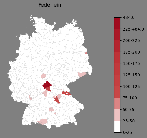 Relative Verteilung des Namens Federlein (1996)Direkt zur Karte Die Farbskala zeigt die Anzahl von "Federlein" bezogen auf je 1 Million Einträge. |
