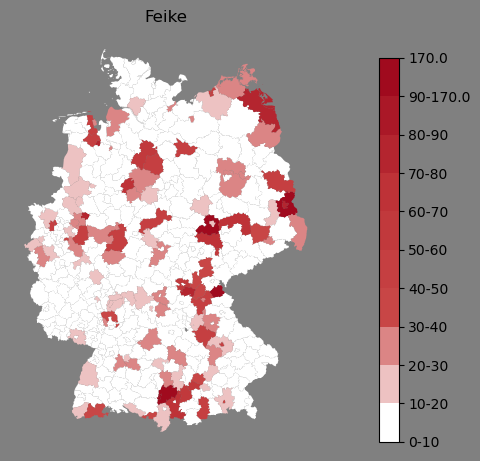 Relative Verteilung des Namens Feike (1996)Direkt zur Karte Die Farbskala zeigt die Anzahl von "Feike" bezogen auf je 1 Million Einträge. |