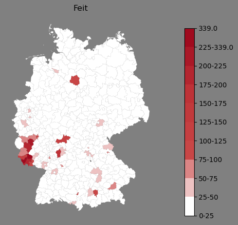 Relative Verteilung des Namens Feit (1996)Direkt zur Karte Die Farbskala zeigt die Anzahl von "Feit" bezogen auf je 1 Million Einträge. |