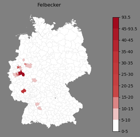 Relative Verteilung des Namens Felbecker (1996)Direkt zur Karte Die Farbskala zeigt die Anzahl von "Felbecker" bezogen auf je 1 Million Einträge. |