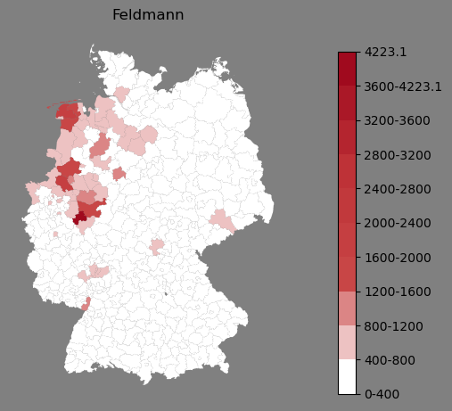 Relative Verteilung des Namens Feldmann (1996)Direkt zur Karte Die Farbskala zeigt die Anzahl von "Feldmann" bezogen auf je 1 Million Einträge. |
