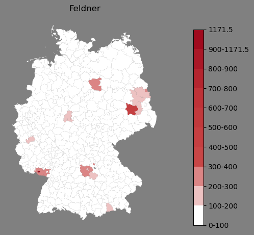 Relative Verteilung des Namens Feldner (1996)Direkt zur Karte Die Farbskala zeigt die Anzahl von "Feldner" bezogen auf je 1 Million Einträge. |