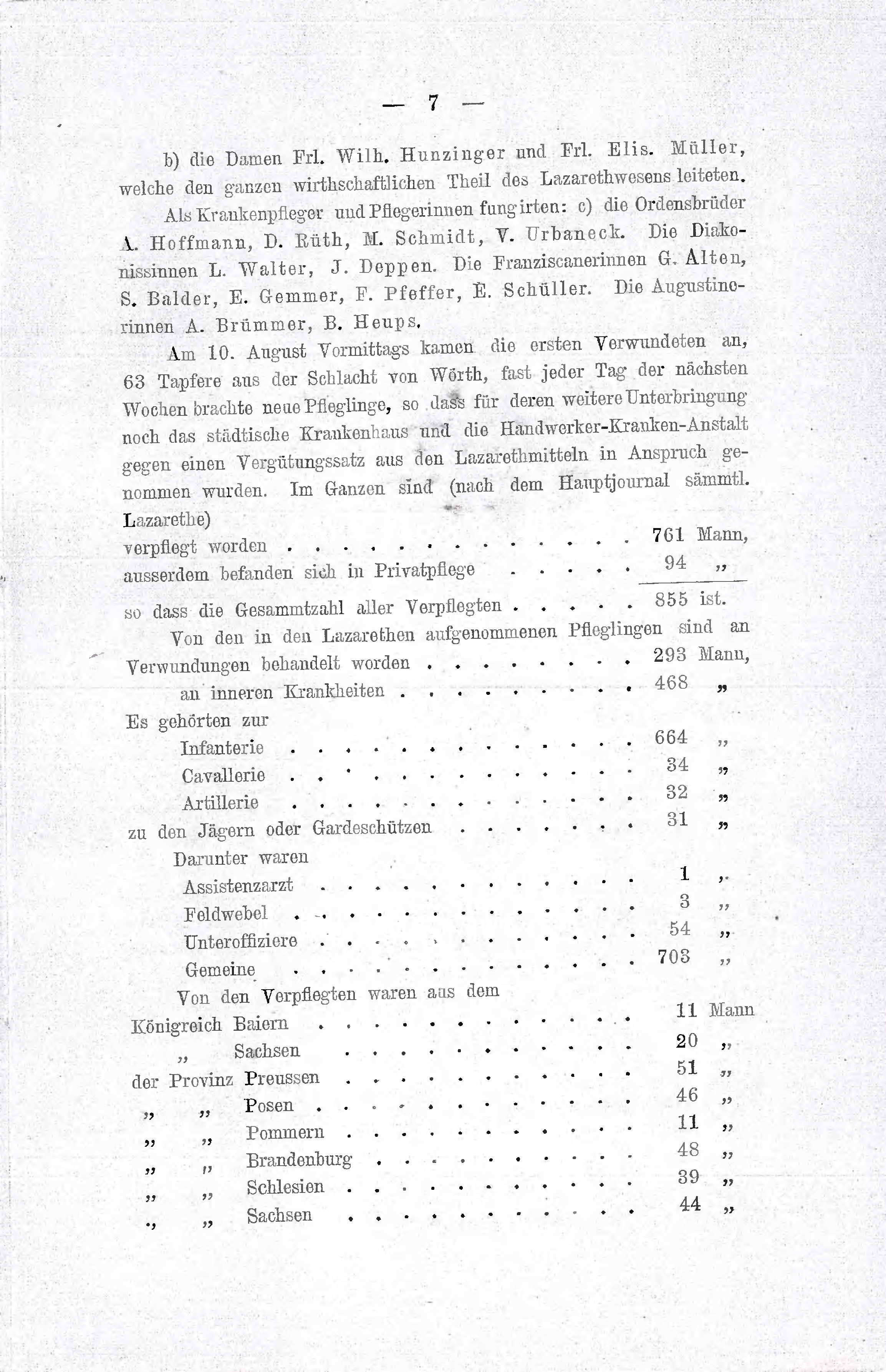 b) die Damen Frl. Wilh. Hunzinger und Frl. Elis. Müller, welche den ganzen wirthschaftlichen Theil des Lazarethwesens leitete. Als Krankenpfleger und Pflegerinnen fungirten: c) die Ordensbrüder A. Hoffmann, D. Rüth, M. Schmidt, V. Urbaneck. Die Diakonissinnen L. Walter, J. Deppen. Die Frallziscanerinnen G. Alten, S. Balder, E. Gemmer, F. Pfeffer, E. Schüller. Die Augustinerinnen A. Brümmer, B. Heups.