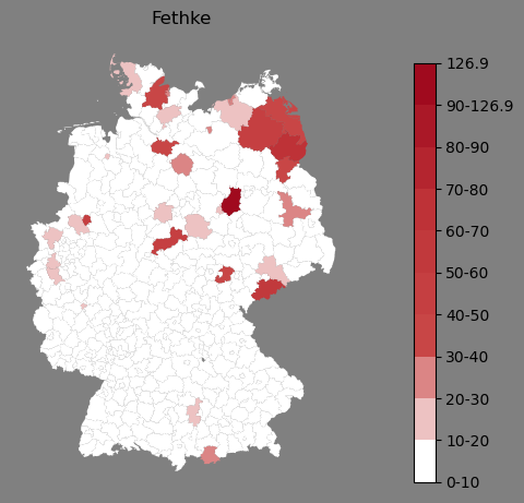 Relative Verteilung des Namens Fethke (1996)Direkt zur Karte Die Farbskala zeigt die Anzahl von "Fethke" bezogen auf je 1 Million Einträge. |