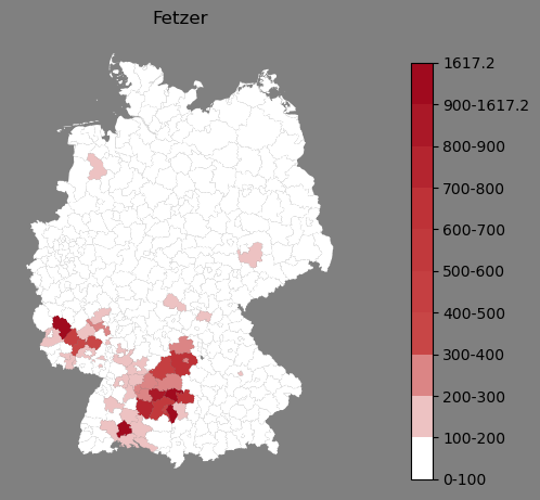 Relative Verteilung des Namens Fetzer (1996)Direkt zur Karte Die Farbskala zeigt die Anzahl von "Fetzer" bezogen auf je 1 Million Einträge. |