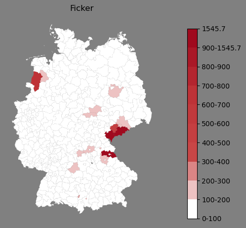Relative Verteilung des Namens Ficker (1996)Direkt zur Karte Die Farbskala zeigt die Anzahl von "Ficker" bezogen auf je 1 Million Einträge. |