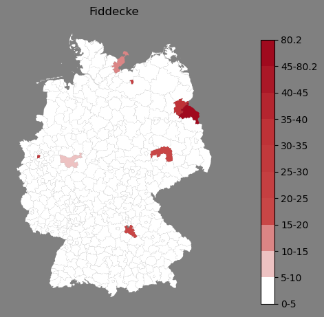 Relative Verteilung des Namens Fiddecke (1996)Direkt zur Karte Die Farbskala zeigt die Anzahl von "Fiddecke" bezogen auf je 1 Million Einträge. |