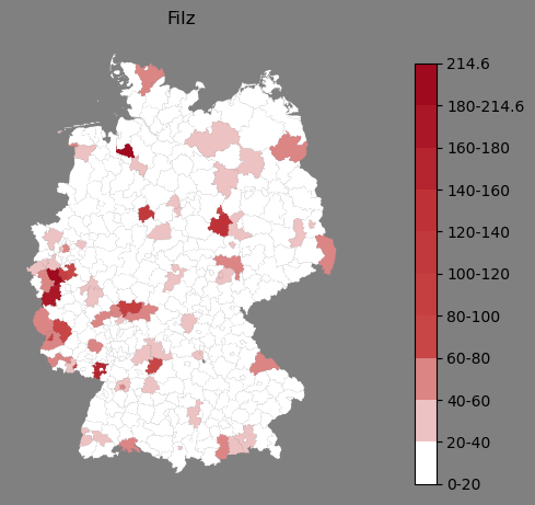 Relative Verteilung des Namens Filz (1996)Direkt zur Karte Die Farbskala zeigt die Anzahl von "Filz" bezogen auf je 1 Million Einträge. |