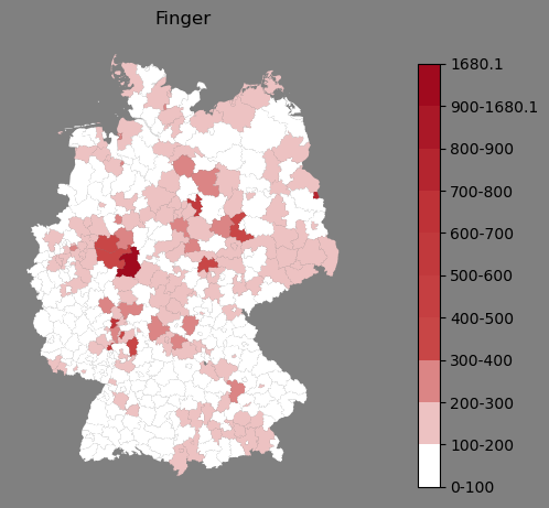 Relative Verteilung des Namens Finger (1996)Direkt zur Karte Die Farbskala zeigt die Anzahl von "Finger" bezogen auf je 1 Million Einträge. |
