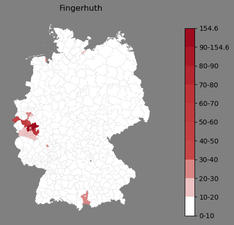 Relative Verteilung des Namens Fingerhuth (1996)Direkt zur Karte Die Farbskala zeigt die Anzahl von "Fingerhuth" bezogen auf je 1 Million Einträge. |