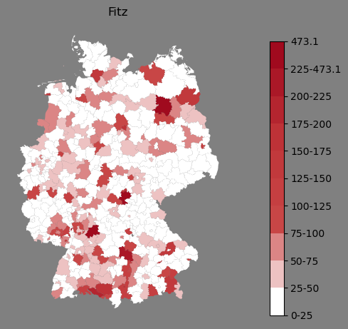 Absolute Verteilung des Namens Fitz (1890)Direkt zur Karte Absolute Verteilung des Namens "Fitz" um 1890 im damaligen Deutschen Reich Sie können die Karte innerhalb des Fensters zoomen und verschieben. |