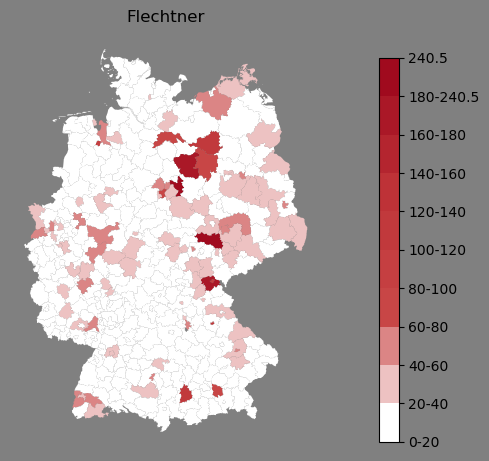 Relative Verteilung des Namens Flechtner (1996)Direkt zur Karte Die Farbskala zeigt die Anzahl von "Flechtner" bezogen auf je 1 Million Einträge. |