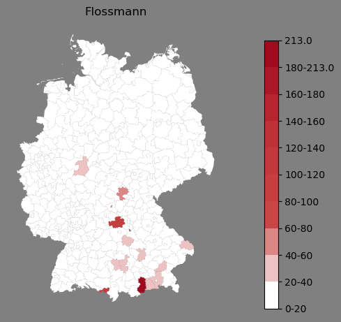 Relative Verteilung des Namens Flossmann (1996)Direkt zur Karte Die Farbskala zeigt die Anzahl von "Flossmann" bezogen auf je 1 Million Einträge. |