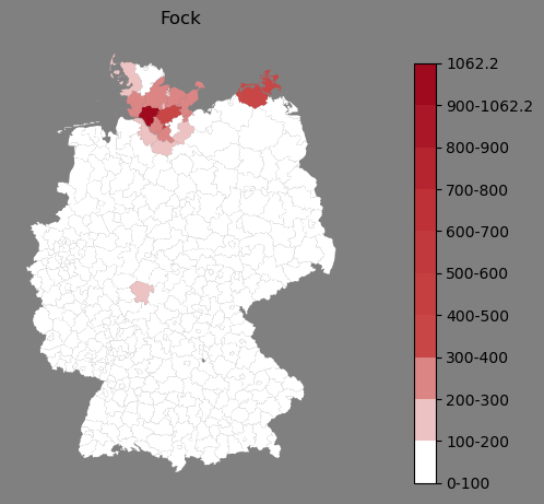 Relative Verteilung des Namens Fock (1996)Direkt zur Karte Die Farbskala zeigt die Anzahl von "Fock" bezogen auf je 1 Million Einträge. |