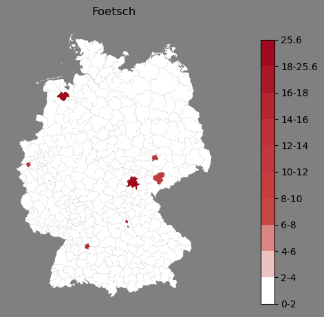 Relative Verteilung des Namens Foetsch (1996)Direkt zur Karte Die Farbskala zeigt die Anzahl von "Foetsch" bezogen auf je 1 Million Einträge. |