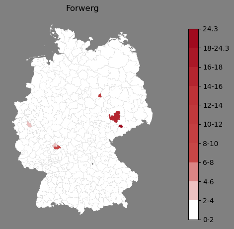 Relative Verteilung des Namens Forwerg (1996)Direkt zur Karte Die Farbskala zeigt die Anzahl von "Forwerg" bezogen auf je 1 Million Einträge. |