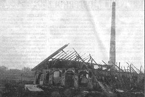 Der gewaltige Ringofen mit den darüberliegenden Trockenböden und ein Teil des Maschinenhauses wurden im Winter 1899 durch Feuer zerstört. Die Anlagen wurden im Jahre 1900 aber wieder nach modernsten Erkenntnissen aufgebaut. Zu Anfang wurde der Ton mit Loren auf Gleisen mit Pferden aus dem Krudoppschen Dobben herangebracht, später, als man den Ton von weiter her aus dem Ahlerschen Grundstück (jetzt Siedlung Glindberg) heranholen mußte, baute man die Drahtseilbahn.