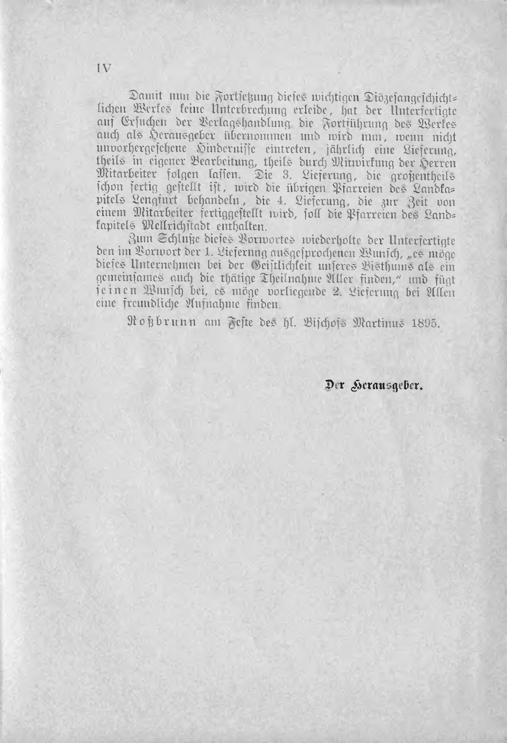 Damit nun die Fortsetzung dieses wichtigen Diözesangeschichtlichen Werkes keine Unterbrechung erleide, hat der Unterfertigte auf Ersuchen der Verlagshandlung, die Fortführung des Werkes auch als Herausgeber übernommen und wird nun, wenn nicht unvorhergesehene Hindernisse eintreten, jährlich eine Lieferung, theils in eigener Bearbeitung, theils durch Mitwirkung der Herren Mitarbeiter folgen lassen. Die 3. Lieferung, die großtentheils schon fertig gestellt ist, wird die übrigen Pfarreien des Landkapitels Lengfurt behandeln, die 4. Lieferung, die zur Zeit von einem Mitarbeiter fertiggestellt wird, soll die Pfarreien des Landkapitels Mellrichstadt enthalten.