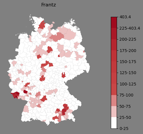 Relative Verteilung des Namens Frantz (1996)Direkt zur Karte Die Farbskala zeigt die Anzahl von "Frantz" bezogen auf je 1 Million Einträge. |