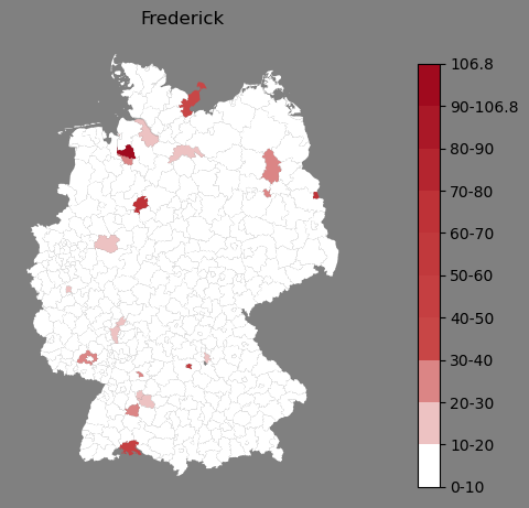 Absolute Verteilung des Namens Frederick (1890)Direkt zur Karte Absolute Verteilung des Namens "Frederick" um 1890 im damaligen Deutschen Reich Sie können die Karte innerhalb des Fensters zoomen und verschieben. |