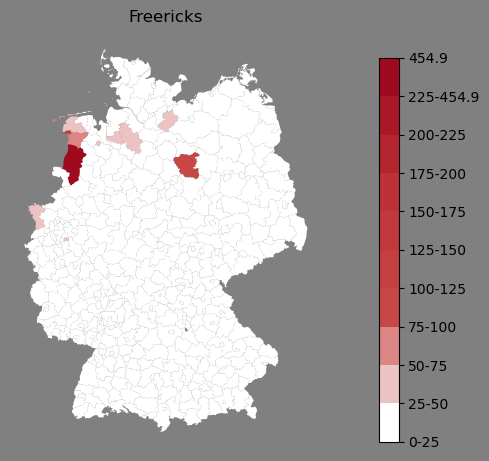 Relative Verteilung des Namens Freericks (1996)Direkt zur Karte Die Farbskala zeigt die Anzahl von "Freericks" bezogen auf je 1 Million Einträge. |