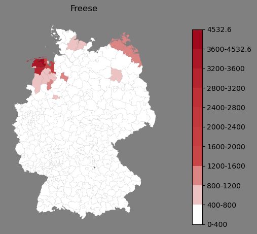 Absolute Verteilung des Namens Freese (1890)Direkt zur Karte Absolute Verteilung des Namens "Freese" um 1890 im damaligen Deutschen Reich Sie können die Karte innerhalb des Fensters zoomen und verschieben. |