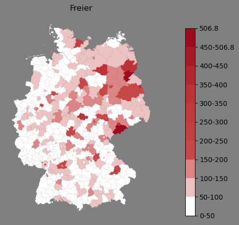 Relative Verteilung des Namens Freier (1996)Direkt zur Karte Die Farbskala zeigt die Anzahl von "Freier" bezogen auf je 1 Million Einträge. |