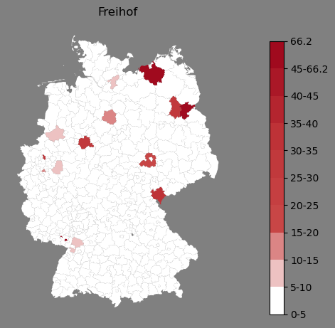 Relative Verteilung des Namens Freihof (1996)Direkt zur Karte Die Farbskala zeigt die Anzahl von "Freihof" bezogen auf je 1 Million Einträge. |