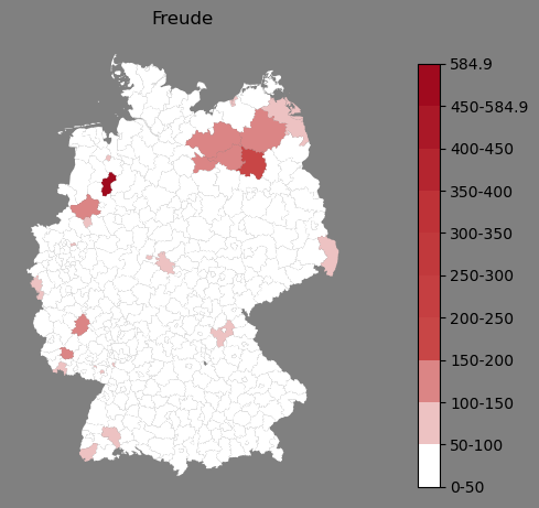 Relative Verteilung des Namens Freude (1996)Direkt zur Karte Die Farbskala zeigt die Anzahl von "Freude" bezogen auf je 1 Million Einträge. |