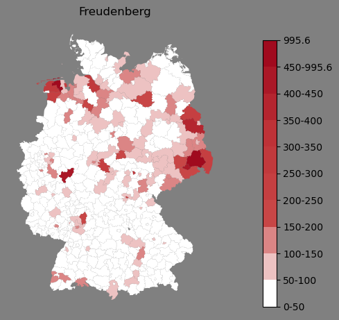 Absolute Verteilung des Namens Freudenberg (1890)Direkt zur Karte Absolute Verteilung des Namens "Freudenberg" um 1890 im damaligen Deutschen Reich Sie können die Karte innerhalb des Fensters zoomen und verschieben. |