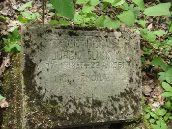 So verstarb vor der Abtrennungszeit 1917 in Schattern Urte Masuhr, geb. Moors [1]. Ethnobiographisch ist sie nur schwer zuzuordnen, da sie deutsche, kurische und eventuell auch litauische Vorfahren hatte. Ihre Familie hat sich aber für eine litauische Inschrift entschieden.