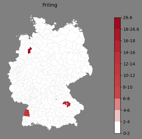 Relative Verteilung des Namens Friling (1996)Direkt zur Karte Die Farbskala zeigt die Anzahl von "Friling" bezogen auf je 1 Million Einträge. |
