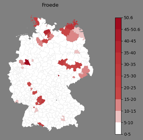 Relative Verteilung des Namens Froede (1996)Direkt zur Karte Die Farbskala zeigt die Anzahl von "Froede" bezogen auf je 1 Million Einträge. |