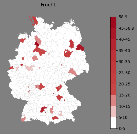 Relative Verteilung des Namens Frucht (1996)Direkt zur Karte Die Farbskala zeigt die Anzahl von "Frucht" bezogen auf je 1 Million Einträge. |