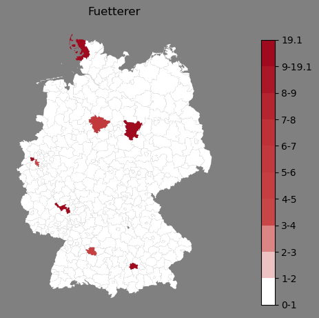 Relative Verteilung des Namens Fuetterer (1996)Direkt zur Karte Die Farbskala zeigt die Anzahl von "Fuetterer" bezogen auf je 1 Million Einträge. |