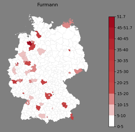Relative Verteilung des Namens Furmann (1996)Direkt zur Karte Die Farbskala zeigt die Anzahl von "Furmann" bezogen auf je 1 Million Einträge. |