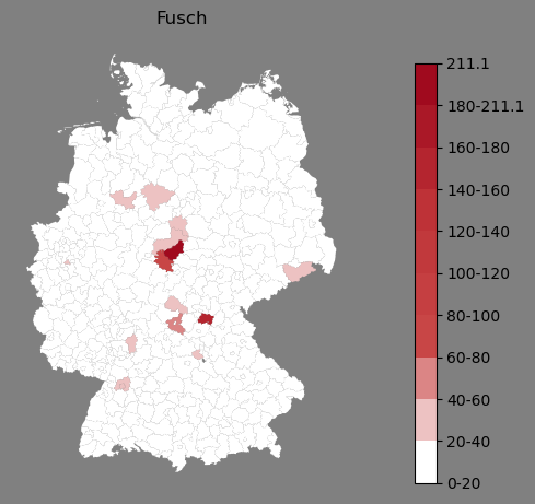 Relative Verteilung des Namens Fusch (1996)Direkt zur Karte Die Farbskala zeigt die Anzahl von "Fusch" bezogen auf je 1 Million Einträge. |