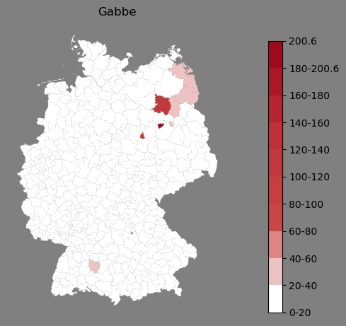 Relative Verteilung des Namens Gabbe (1996)Direkt zur Karte Die Farbskala zeigt die Anzahl von "Gabbe" bezogen auf je 1 Million Einträge. |