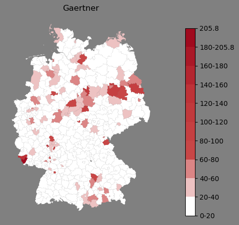 Relative Verteilung des Namens Gaertner (1996)Direkt zur Karte Die Farbskala zeigt die Anzahl von "Gaertner" bezogen auf je 1 Million Einträge. |