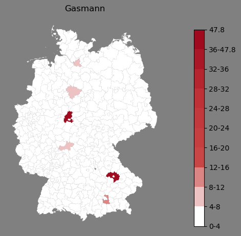 Relative Verteilung des Namens Gasmann (1996)Direkt zur Karte Die Farbskala zeigt die Anzahl von "Gasmann" bezogen auf je 1 Million Einträge. |