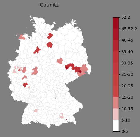 Relative Verteilung des Namens Gaunitz (1996)Direkt zur Karte Die Farbskala zeigt die Anzahl von "Gaunitz" bezogen auf je 1 Million Einträge. |