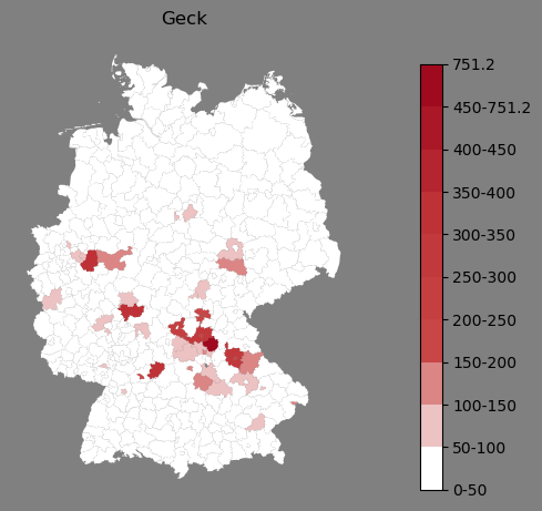 Relative Verteilung des Namens Geck (1996)Direkt zur Karte Die Farbskala zeigt die Anzahl von "Geck" bezogen auf je 1 Million Einträge. |