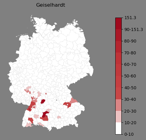 Absolute Verteilung des Namens Geiselhardt (1890)Direkt zur Karte Absolute Verteilung des Namens "Geiselhardt" um 1890 im damaligen Deutschen Reich Sie können die Karte innerhalb des Fensters zoomen und verschieben. |