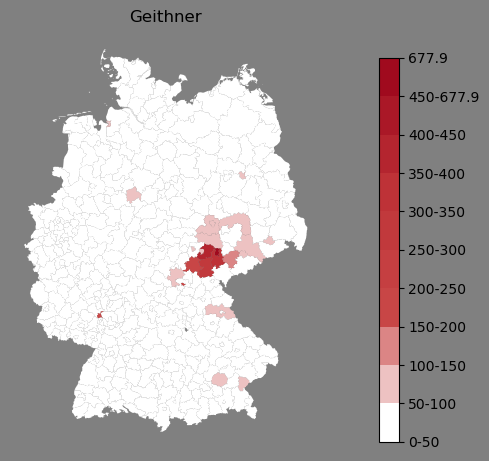Relative Verteilung des Namens Geithner (1996)Direkt zur Karte Die Farbskala zeigt die Anzahl von "Geithner" bezogen auf je 1 Million Einträge. |